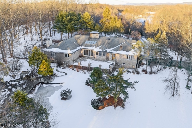 Quiet luxury meets elevated living on 13 private, gated acres backing the Paulinskill Trail. Built as the builder's own residence, this expanded ranch showcases a rare blend of privacy, craftsmanship, and resort-style amenities. The main home features 4 bedrooms and 4.2 baths, including a first-floor primary suite with fireplace, custom walk-in closet, and French Carrara marble bath. The light-filled family room offers soaring ceilings, skylights, custom built-ins, and a floor-to-ceiling stone fireplace with French doors to the patio. The chef's kitchen is the heart of the home with breakfast bar, sunny breakfast nook, walk-in pantry with wine fridge, and grounding 200-year-old tiles from a Spanish Monastery. Radiant heated floors span the home, along with solid-oak doors and trim, and a level of quality rarely seen in today's construction. Nine-foot ceilings throughout enhance the sense of scale and light. Outdoors, enjoy a heated gunite pool with waterfalls, hot tub, and waterslide. A separate two-bedroom carriage house is ideal for live-in help or home business and offers three garage bays with heat and A/C. In total, the property offers 6+ oversized garages, 700-amp electrical service, a full-home automatic generator, and three wells. The finished lower level includes a wine cellar, entertainment area with bar, commercial-grade gym and half bath. Minutes from Sparta and just over an hour from Manhattan, this is a one-of-a-kind opportunity to own a remarkable estate! GSMLS 4008454