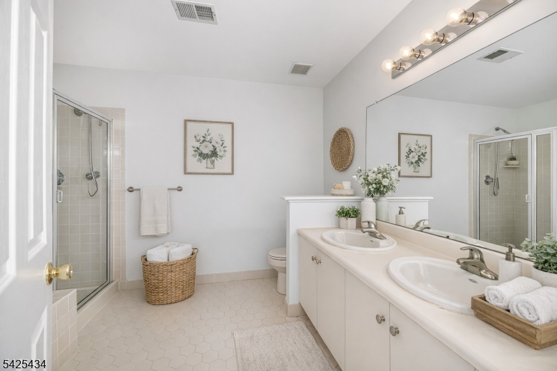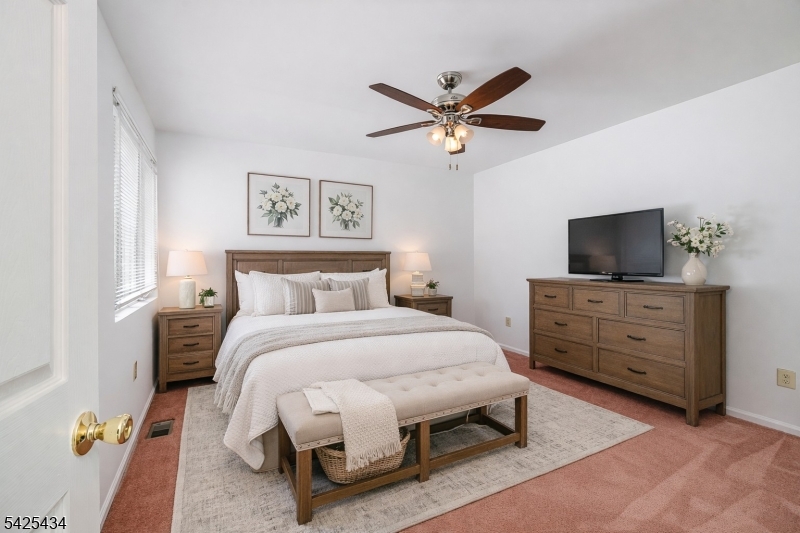 This home features an inviting approach with an Iris garden leading to a well-manicured, landscaped paver entranceway, with the garage exiting into a private covered vestibule for added privacy. Inside, the layout offers multiple living areas and good natural light throughout. The eat-in kitchen provides ample cabinet space and room for a dining table, while the main living area is a combined living room/dining room. Bedrooms are well-sized, including a primary bedroom with a full bath and vaulted ceilings. There is also a main bathroom on the second floor to accommodate additional bedrooms. Bathrooms are clean and neutral. The interior is freshly painted with neutral tones, carpets have been cleaned, and the home is ready for quick delivery. Outdoor amenities include access to a nearby in-ground pool, tennis court, and clubhouse just a short walk away offering additional space for recreation and entertaining. Hanover Township features highly rated schools, a low tax rate, and is conveniently located near major highways, shopping centers, and restaurants, providing easy access for commuting and everyday needs. Photos are virtually staged. GSMLS 4021736