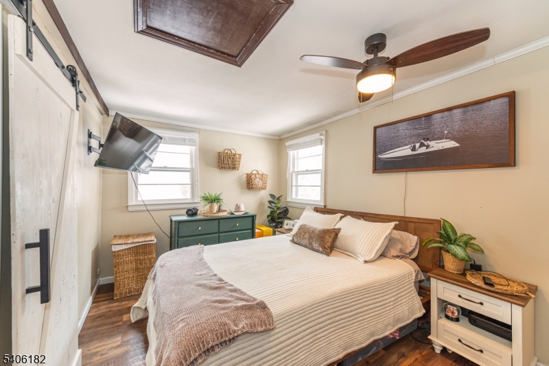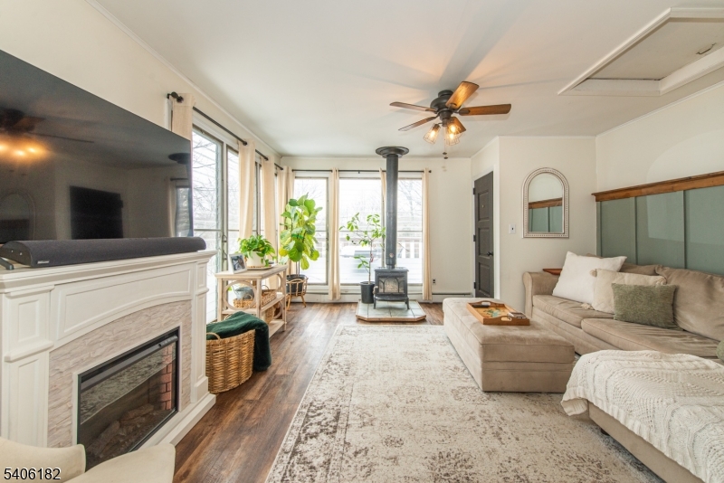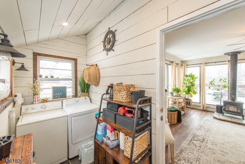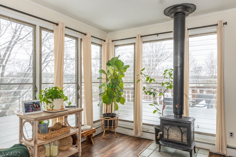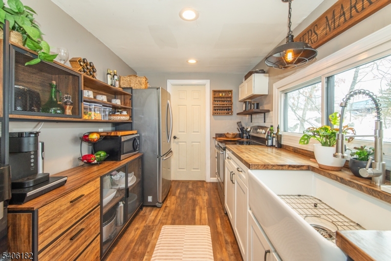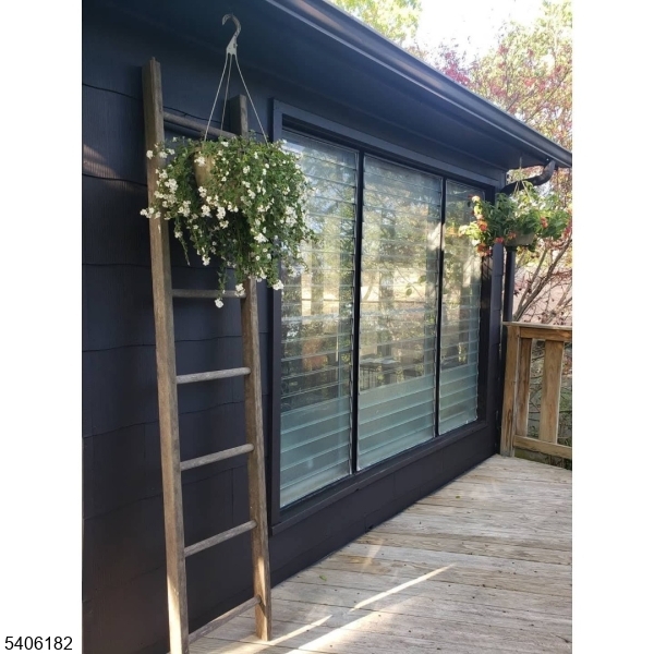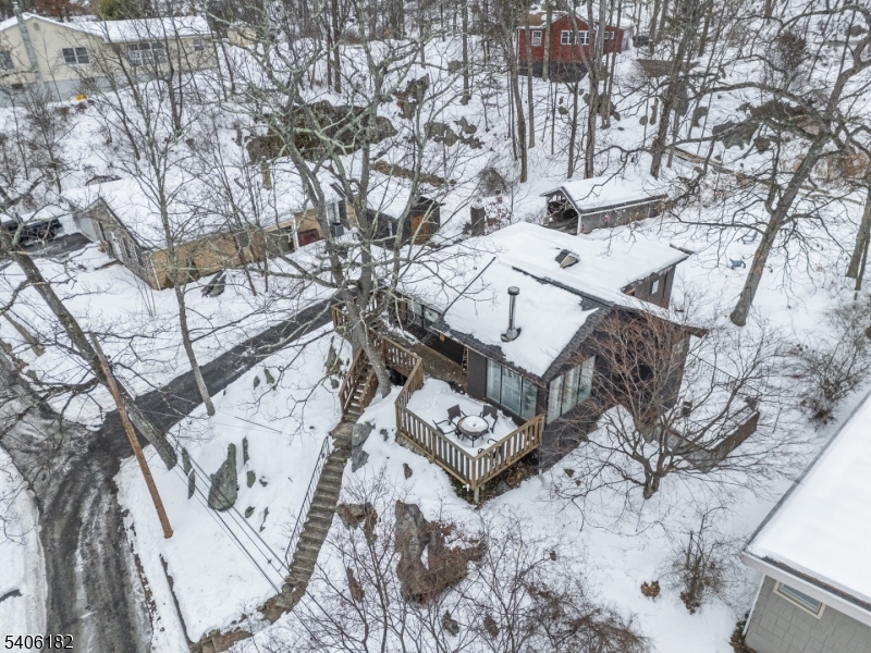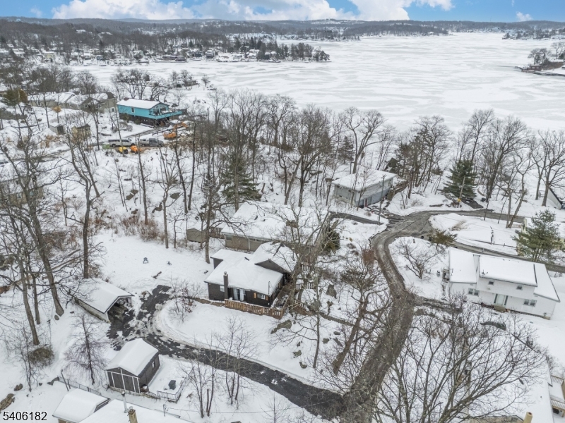 Perched high above picturesque Lake Hopatcong, this charming, updated farmhouse-style ranch feels like a private retreat, surrounded by nature and seasonal lake views. Enjoy glimpses of the water from the wraparound porch and through the floor to ceiling living room windows, where the changing scenery adds to the home's warm, inviting character.Inside, the sun-filled living room features expansive windows and a centrally located wood-burning stove, creating a cozy focal point for relaxing or entertaining. The kitchen blends rustic charm with modern convenience, offering stainless steel appliances, butcher block countertops, a pantry, and a classic farmhouse sink. Just beyond, the bright dining room opens to the wrap around deck, making indoor-outdoor gatherings effortless.The primary bedroom includes double closets, while the second bedroom offers flexibility as a guest room or home office. A practical mudroom with washer and dryer leads to a separate deck and the flat, usable backyard.Outside, the level yard is ideal for entertaining or unwinding and is complemented by a detached carport and storage shed. Optional membership to the Byram Bay Community Beach Club offers access to swimming, a playground, and seasonal activities with the neighborhood. Just minutes from Lake Hopatcong's boating, kayaking, dining, and year-round recreation, this inviting retreat blends comfort, character, and scenic surroundings. GSMLS 4008163