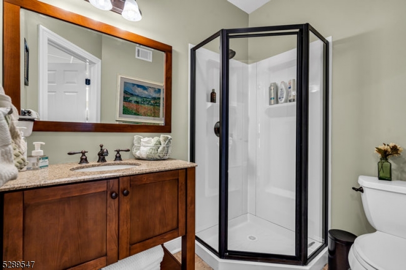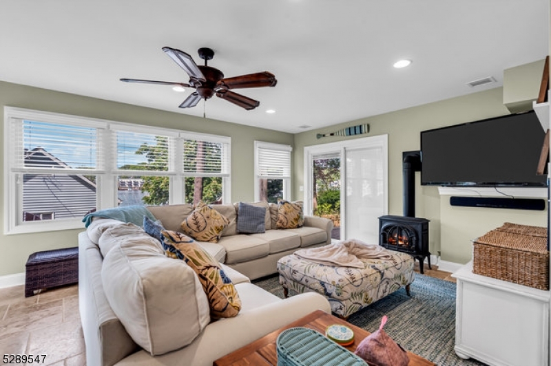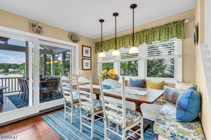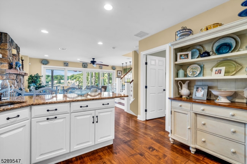 Stylish lakefront. Spectacular lake view from the covered porch. Enjoy those lazy summer days and evenings for dining and lounging around the gas firepit. An open floorplan designed to entertain. Custom well-appointed kitchen boasting stainless appliances, wood cabinetry, granite countertops, and a breakfast bar that opens to the living/dining room with views to the gas fireplace and covered porch. This 5-bedroom home offers a 1st-floor full bedroom w/full bath in the hall and first-floor laundry rm. 4 additional bedrooms include the primary bedroom with a walk-in closet and ensuite bath facing the lake. 3 additional bedrooms and a full guest bath. The finished lower level offers a flexible floor plan to add a kitchen as there is a full bath and a spacious open floor plan for your lakeside living. Two sets of glass slider doors lead out to the patio overlooking the lake. This home shares a common area lakefront and dock. So many interior and exterior details that make this home maintenance-free! Be in for this summer and enjoy NJ's largest lake, just one hour to NYC with local rail service. Walk to town location for restaurants, shops, house of worship, and nearby town park. Enjoy motor boats, kayaks, jet skis, and more as this community offers scenic year-round living with access to hiking, biking, golf/tennis resorts and winter activities on the lake. GSMLS 4015700
