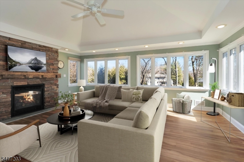 Modern Elegance Meets Every-Day Comfort at 12 Wilson Terrace Welcome to this glittering gem, where natural light and high-end finishes invite you to move right in. This beautifully updated 3-bedroom, 4-full-bath home masterfully balances an open-concept flow with private retreats. The Main Level: Gleaming hardwood floors lead you from the inviting entry into a formal living room and a spacious dining area. The updated kitchen, featuring granite countertops, stainless steel appliances, & a convenient pass-through to the stunning heart of the the home: The Great Room. with its soaring ceilings, gas fplc & floor-to-ceiling stone mantle, has direct access to the paver patio. This space is an entertainer's dream. A versatile first-floor office w/closet (or perfect for overnight guests) & a full guest bath complete this level. The Upper Level: Retreat to the expansive Primary Suite, which spans the entire side of the second floor and features a walk-in closet, a private dressing vanity, and an en-suite bath. Two additional bedrooms share another full hall bath, with one bedroom offering a convenient secondary laundry hook-up. The Lower Level & Beyond: The basement adds incredible value with a recreation room, custom bar, a 4th full bath and a workshop. Outside, the lush backyard and patio are easily accessible via Bilco doors. Also included is a whole house generator. Perfectly situated near top-tier schools, NYC transportation, shopping, and dining this home truly has it all! GSMLS 4015481